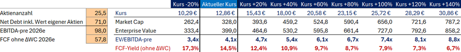 Warum wir die Bewertung für unangemessen halten: Medios wird auf Basis unserer Prognose für 2026 mit einem Forward EV/EBITDA von 4,1x bewertet. Die Free-Cashflow-Yield ohne Working-Capital-Veränderungen liegt bei 14,5 Prozent. Ein gedankliches Experiment verdeutlicht die Dimension: Würde Medios nicht mehr wachsen und den gesamten Free Cashflow in Aktienrückkäufe investieren, wären rechnerisch in weniger als sechs Jahren sämtliche Aktien zurückgekauft. Das vereinfacht natürlich – allein die damit einhergehende Aktienverknappung würde einen unveränderten Kurs unrealistisch machen. Aber die Arithmetik zeigt, wie günstig Medios aktuell bewertet ist.